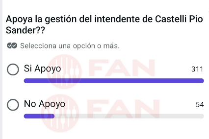 Una reciente encuesta impulsada por Radio Fan volvió a poner en agenda la valoración ciudadana sobre la gestión municipal en Juan José Castelli. El sondeo, que permaneció activo durante 48 horas en el canal del medio, arrojó resultados contundentes a favor del actual intendente, Pío Sander.