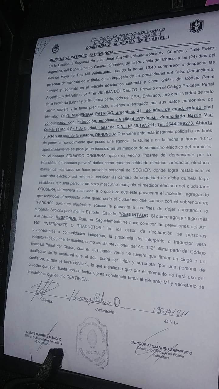 Y agregó, “horas más tarde al revisar las cámaras de seguridad observé que esta misma persona que se ofreció para realizar los trabajos estuvo manipulando el medidor que se incendió”.