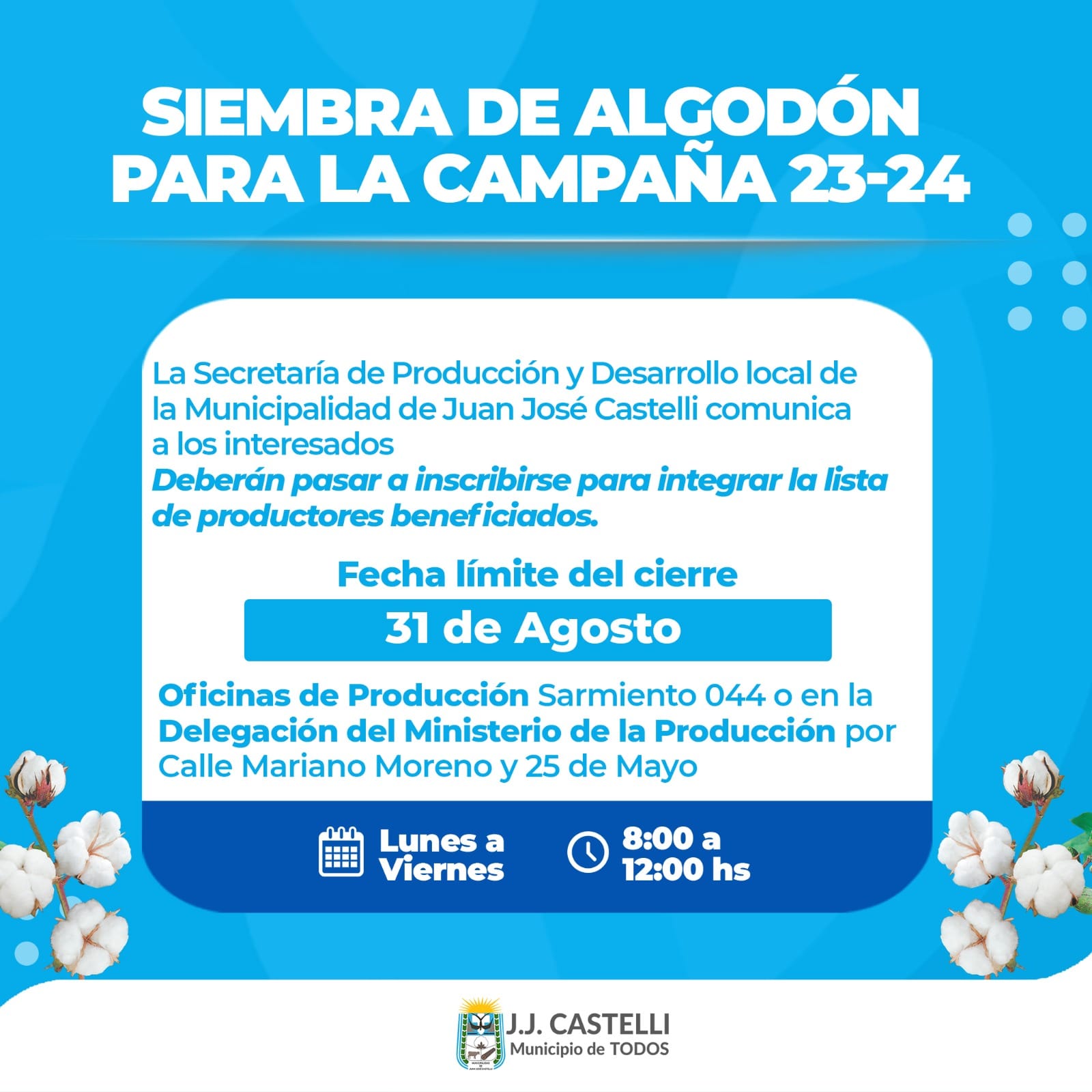 La Secretaría de Producción y Desarrollo Local de la Municipalidad de Juan José Castelli comunica a los interesados en la siembra de algodón para la campaña 23- 24 que deberán pasar a inscribirse para integrar la lista de productores beneficiados .