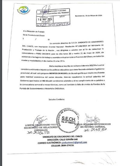 "En su séptima semana consecutiva y atendiendo la voz de sus afiliados este Sindicato llama a nuevas medidas de fuerzas, para los días 20 y 21 de mayo, con asamblea virtual el día martes 21 a las 19:00 horas. Las bases decidieron parar ante la indiferencia del Ejecutivo Provincial ya que mantiene su postura de no convocar Mesa de Política salarial y condiciones de trabajo ni a Mesas Técnicas, incumpliendo la palabra empeñada, donde se comprometía a reuniones semanales. La falta de sensatez y sustento pedagógico para realizar evaluaciones que solo arrojan números negativos, que resultan innecesarios y traumáticos para los alumnos como lo fue el censo de fluidez y comprensión lectora, para utilizar políticamente los datos, en lugar de trabajar en políticas educativas serias y adecuadas a nuestra realidad socio-económica. Temas que deben ser tratados en un congreso pedagógico provincial.