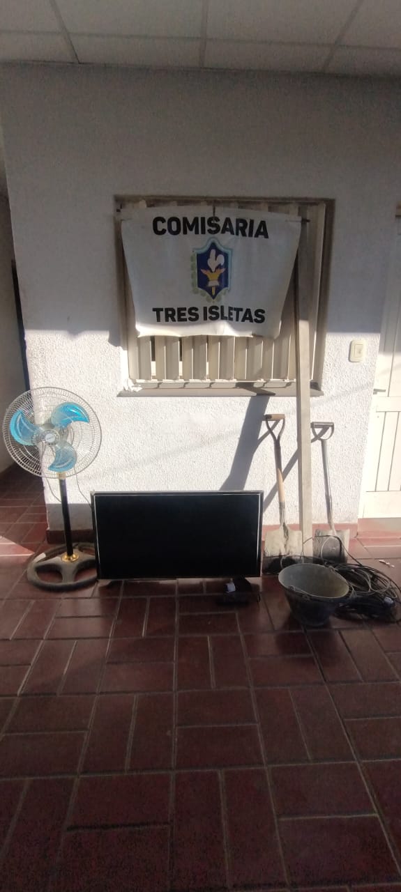 Comenzando con el dia 09 del corriente mes y año en la comisaria de Tres Isletas, en horas de la siesta el personal policial realizó allanamientos en diferentes domicilios de esa ciudad. Conforme decreto. Con los siguientes resultados: logrando el secuestro de un 1 televisor 32”, color negro, 1 control remoto, 1 ventilador de pie, 1 alargue 8 mts. (secuestro impostergable, 2 regla de hierro, 1 pala ancha, 2 baldes tipo albañilería, de plástico. El Fiscal interviniente dispuso identificación en la causa del ciudadano L.R.J.