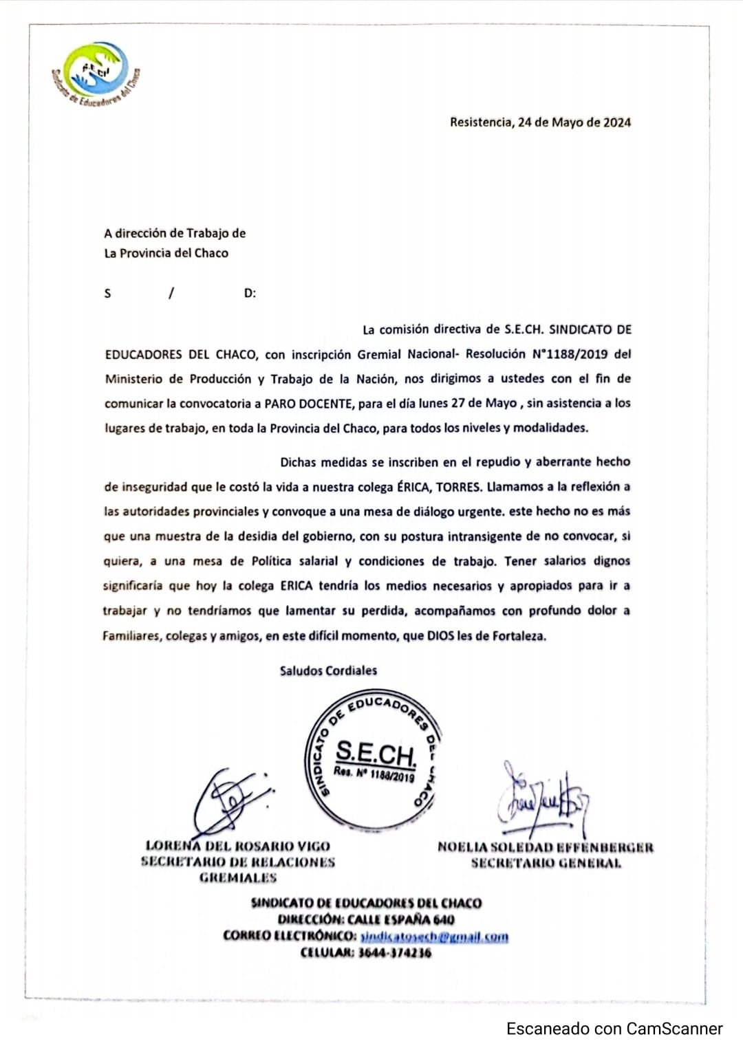 El S.E.CH. convocó a un paro docente para el 27 de mayo, la medida se inscribe en repudio al aberrante hecho de inseguridad que le costó la vida a Erica Torres.