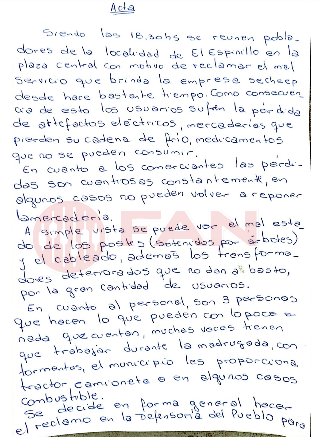 Señaló que en la reunión firmaron dos actas, una de ellas será presentada por el intendente en Resistencia para tratar de buscar una solución a la problemática, la otra será presentada ante la defensoría del Pueblo por los vecinos el día jueves. “Pedimos un servicio básico que no nos dan, por eso nos movilizamos”.