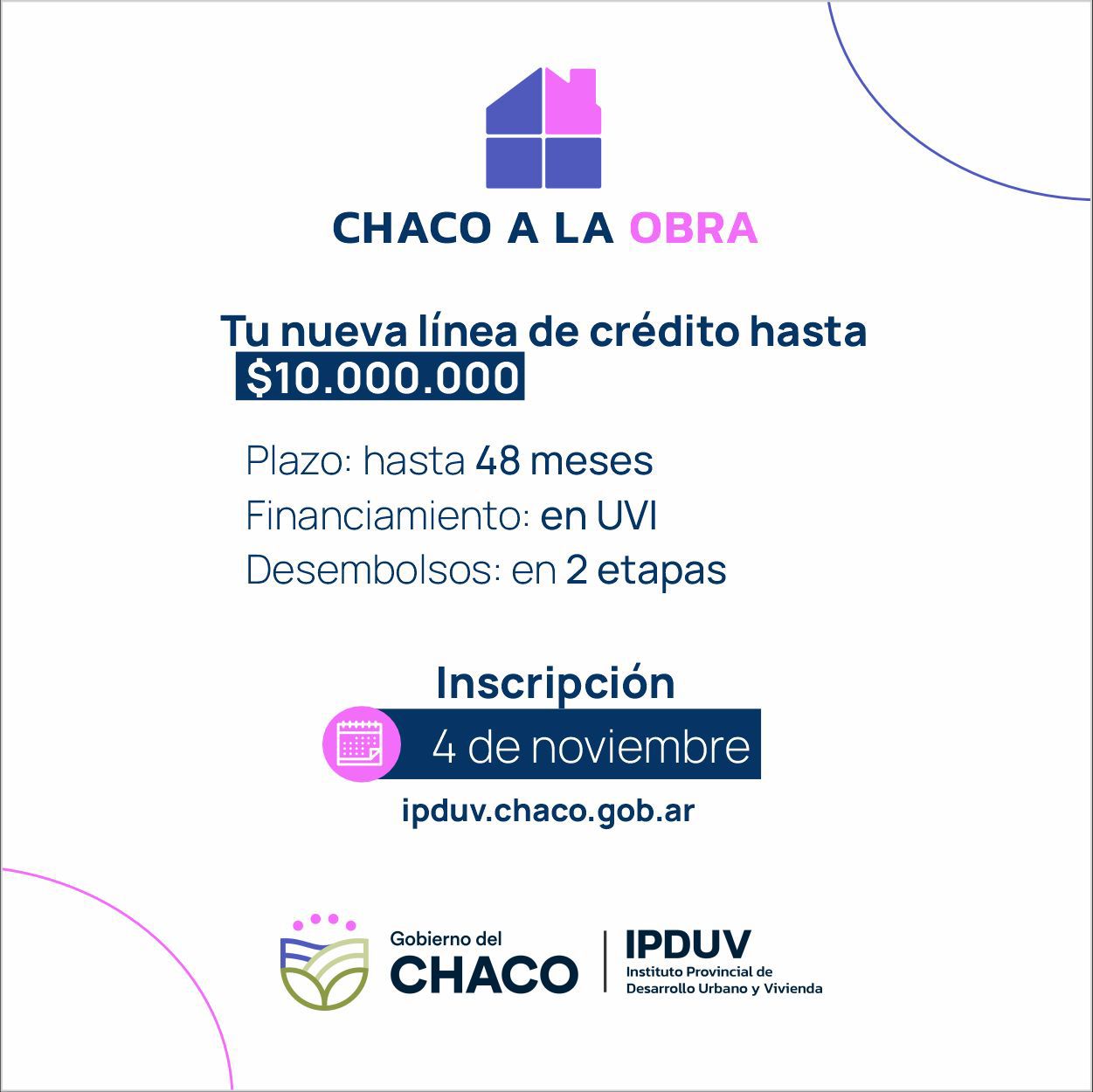 La línea contará con tres modalidades: una de cuatro millones, otra de siete millones y una tercera de diez millones. La inscripción para acceder a estos créditos comenzará el 4 de noviembre y se extenderá hasta el 25 del mismo mes. Es importante señalar que el proceso se realizará exclusivamente en ipduv.chaco.gob.ar, sin atención presencial, mientras que toda la información de la operatoria será cargada en dicho sitio como también en las redes sociales del organismo.