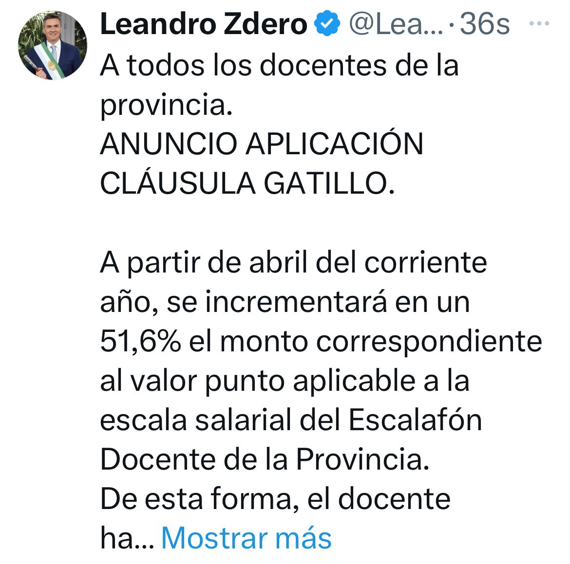 El gobernador Leandro Zdero, anunció esta mañana, a través de sus redes sociales el cumplimiento de la Cláusula Gatillo a partir de abril del corriente año donde se incrementará en un 51,6% el monto correspondiente al valor punto aplicable a la escala salarial del Escalafón Docente de la Provincia.
