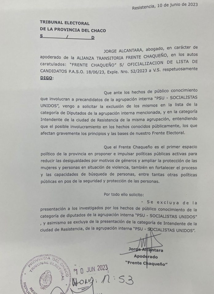 El Frente Chaqueño solicitó a la justicia electoral la exclusión de Sena y Acuña como precandidatos de la Lista 652 PSU